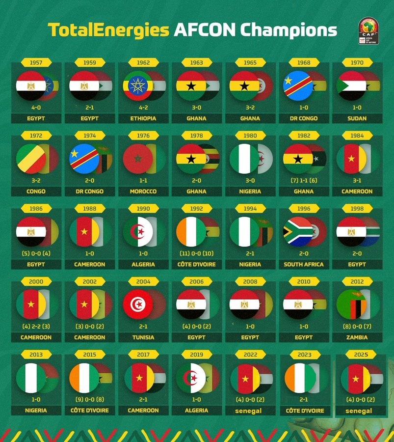 وفي ما يلي سجل الفائزين بلقب بطولة كأس الأمم الأفريقية لكرة القدم منذ انطلاقها: