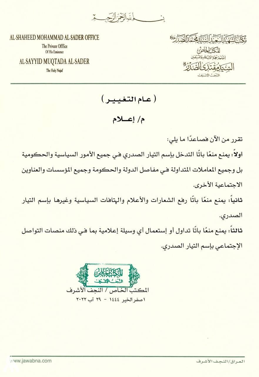 وجاء البيان في أعقاب إعلان الصدر، اعتزاله النهائي للسياسة، وإغلاق المراكز التابعة له.