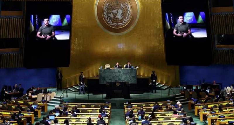دعا الرئيس الأوكراني فولوديمير زيلينسكي الأمم المتحدة الى “فرض عقاب عادل ضد ؤيتمثل بحرمانها من حق النقض (الفيتو)”، معتبراً أن هناك جريمة ارتُكبت ضد أمته، ومطالباً إقامة صندوق لتعويض أوكرانيا.