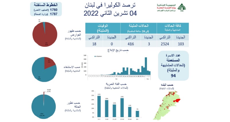 سجلت وزارة الصحة العامة ثلاث إصابات جديدة بوباء الكوليرا، ما رفع العدد التراكمي للحالات المثبتة إلى 416، فيما لم يتم تسجيل اي حالة وفاة، وسجل العدد التراكمي للوفيات 18، وفق التقرير اليومي للوزارة.