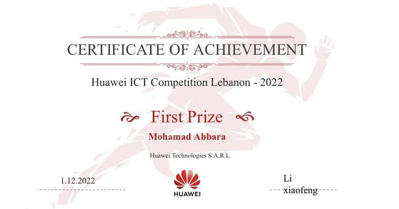 فاز الطالب محمد فريد عبّارة من كلية الهندسة – الفرع الثالث في الجامعة اللبنانية (سنة رابعة كهرباء وإلكترونيك) بالجائزة الأولى من مسابقة شركة هواوي (Huawei ICT Competition Lebanon-2022).