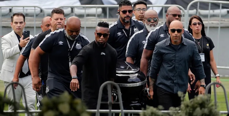 سُجي جثمان أسطورة كرة القدم البرازيلية، بيليه، الاثنين، في ملعب نادي سانتوس البرازيلي، الذي شهد انطلاقة اللاعب الراحل نحو النجومية في عالم كرة القدم.