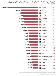 اما دولة الامارات العربية فقد احتلت المرتبة الاولى عربياً و15 عالمياً، واحتفظ جواز السفر الإماراتي بمكانه في مؤشر “هانلي” لجوازات السفر، بقدرة حامله على دخول 178 دولة دون تأشيرة مسبقة أو تأشيرة عند الوصول.