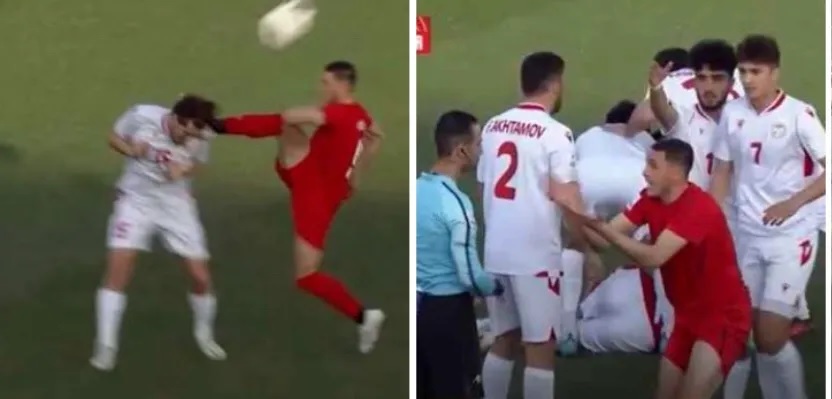 وبعد لحظات من إطلاق صافرة بداية المباراة، تدخل الكلبوني على أحد لاعبي منتخب طاجيكستان، حيث رفع قدمه عاليا للحاق بكرة، لكنها اصطدمت بوجه منافسه.