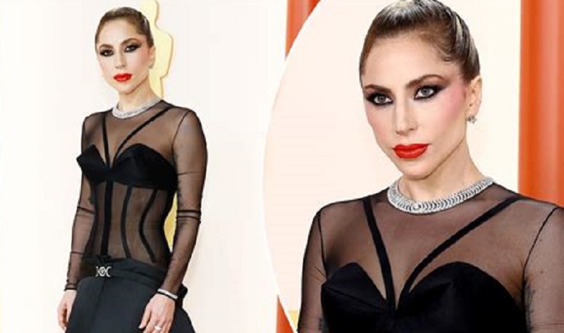 ظهرت ليدي غاغا بإطلالة درامية سوداء خلال حفل أوسكار لعام 2023، باختيارها لثوب أسود من Versace تم تقديمه خلال عرض الدار الأخير منذ بضعة أيام، وارتدته على ممشى العرض العارضة الفلسطينية الأصل جيجي حديد.