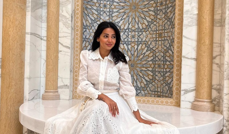 ونسقت رحمة التنورة مع قميص أنيق باللون الأبيض كذلك، مميز بلمسات أنثوية بأكتاف منتفخة وجيب جانبي مطرز، كما زينت تطريزات مطابقة للتنورة كل من الياقة المثنية والمعصمين وكذلك الجيب.