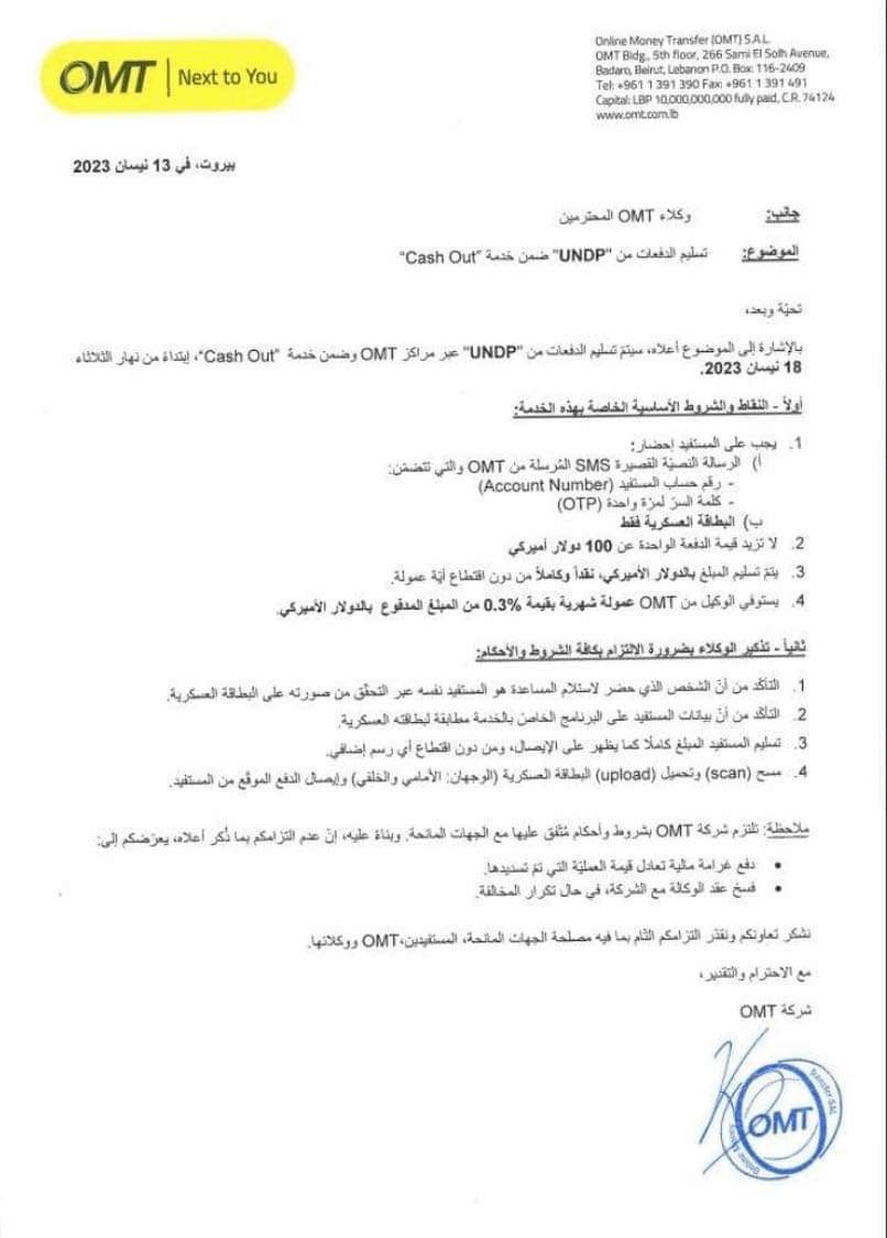 عممت شركة OMT على وكلائها ببدء دفع مبلغ 100 دولار أميركي للعسكريين، بناء لاتفاق بين المديرية العامة لقوى الأمن الداخلي وUNDP، اعتبارًا من يوم الثلاثاء في 18 نيسان.