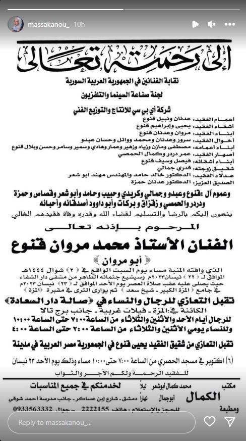 ونعى عدد كبير جدا من الفنانين والنجوم الفنان الراحل، الا ان الانظار اتجهت الى ابنته ماسة قنوع، التي ترافقه في اغلب اطلالته.