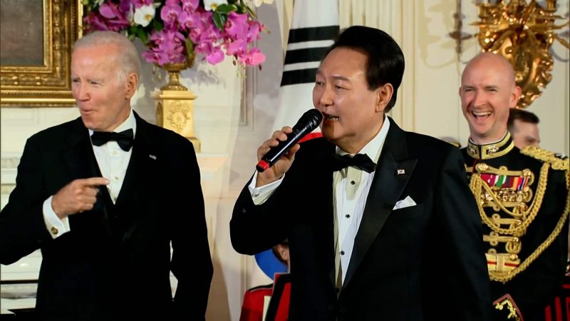 ففي نهاية حفل عشاء مبهج أقيم في البيت الأبيض أمس الأربعاء، انتقل الرئيس جو بايدن والسيدة الأولى جيل بايدن والرئيس يون وزوجته كيم كون هي، من قاعة الطعام الرسمية للقاعة الشرقية للاستمتاع بمجموعة من العروض الموسيقية.
