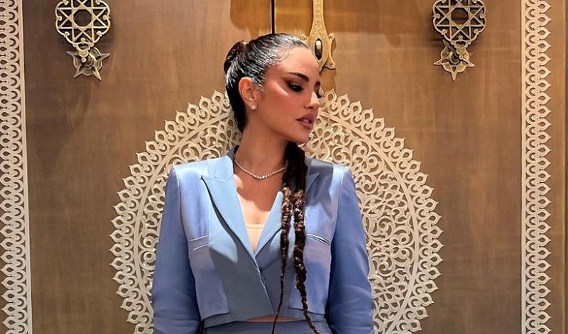 تألقت النجمة التونسية درة زروق مؤخرًا بإطلالة أنيقة باللون الأزرق السماوي، حيث ارتدت تنورة ميدي حريرية مجسمة، ونسقت معها بليزر قصير من نفس الخامة واللون، مع أكمام طويلة وياقة صغيرة وفتحة صدر على شكل حرف 7 باللغة العربية.