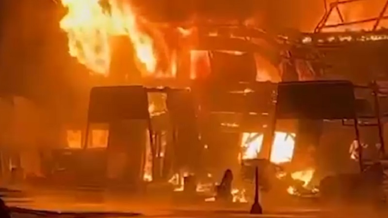وتصاعدت أعمدة الدخان الأسود وألسنة النيران فوق المنطقة، فيما لم تتحدث الأنباء عن سقوط ضحايا أو إصابات جراء الحريق.