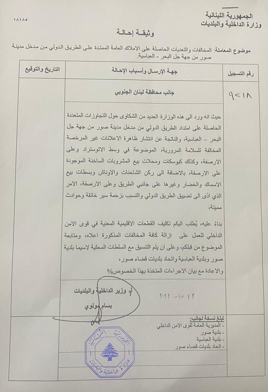 وجه وزير الداخلية والبلديات في حكومة تصريف الأعمال القاضي بسام مولوي، كتاباً الى محافظة لبنان الجنوبي حول المخالفات والتعديات الحاصلة على الأملاك العامة، الممتدة على الطريق الدولي من مدخل مدينة صور من جهة جل البحر – العباسية،