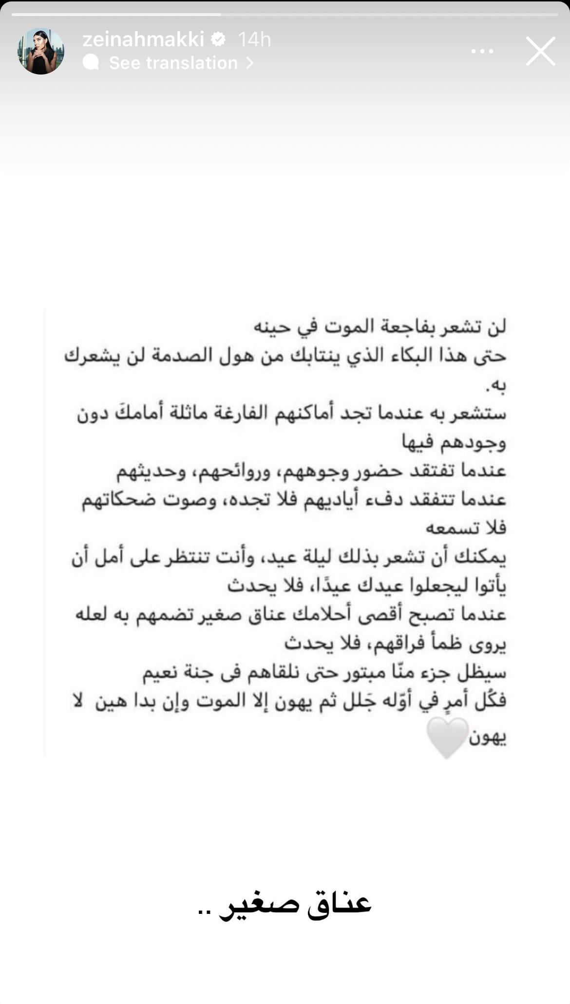 وفي منشور عبر خاصية القصص القصيرة على حسابها عبر انستغرام، كتبت زينة مكي: “لن تشعر بفاجعة الموت في حينه، حتى هذا البكاء الذي ينتابك من هول الصدمة لن يشعرك به.. ستشعر به عندما تجد أماكنهم الفارغة ماثلة أمامك دون وجودهم فيها.. عندما تفتقد حضور وجوههم وروائحهم وحديثهم، عندما تفقد دفئ اياديهم فلا تجدهـ وصوت ضحكاتهم فلا تسمعه”.