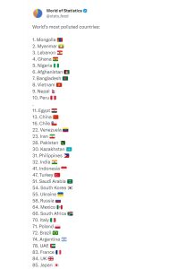وانتقالا إلى لبنان، والذي يعتبر الدولة العربية الوحيدة ضمن القائمة، فيواجه أزمة كبيرة في إدارة النفايات، مما أدى إلى مخاطر بيئية وصحية شديدة، يعد تلوث الهواء في المناطق الحضرية قضية مهمة أخرى، ويرجع ذلك أساسًا إلى انبعاثات السيارات بشكل رئيسي، وقد أدى الفساد وغياب الحكومة والأزمة السياسية والإقتصادية إلى تعطل أغلبية المشاريع البيئية وجفاف الأنهار وأيضا إلى ارتفاع نسبة الحرائق في الدولة خلال السنوات الأخيرة.