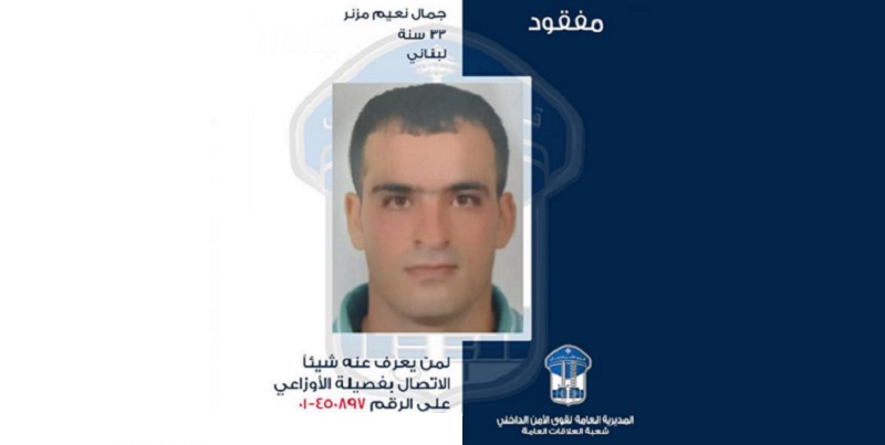 عممت المديرية العامّة لقوى الأمن الداخلي، بناءً على إشارة القضاء المختصّ صورة المفقود: جمال نعيم مزنر (مواليد عام 1990، لبناني)، الذي غادر منزله الكائن في محلّة الجناح بتاريخ 15/03/2023، ولم يعُد لغاية تاريخه.