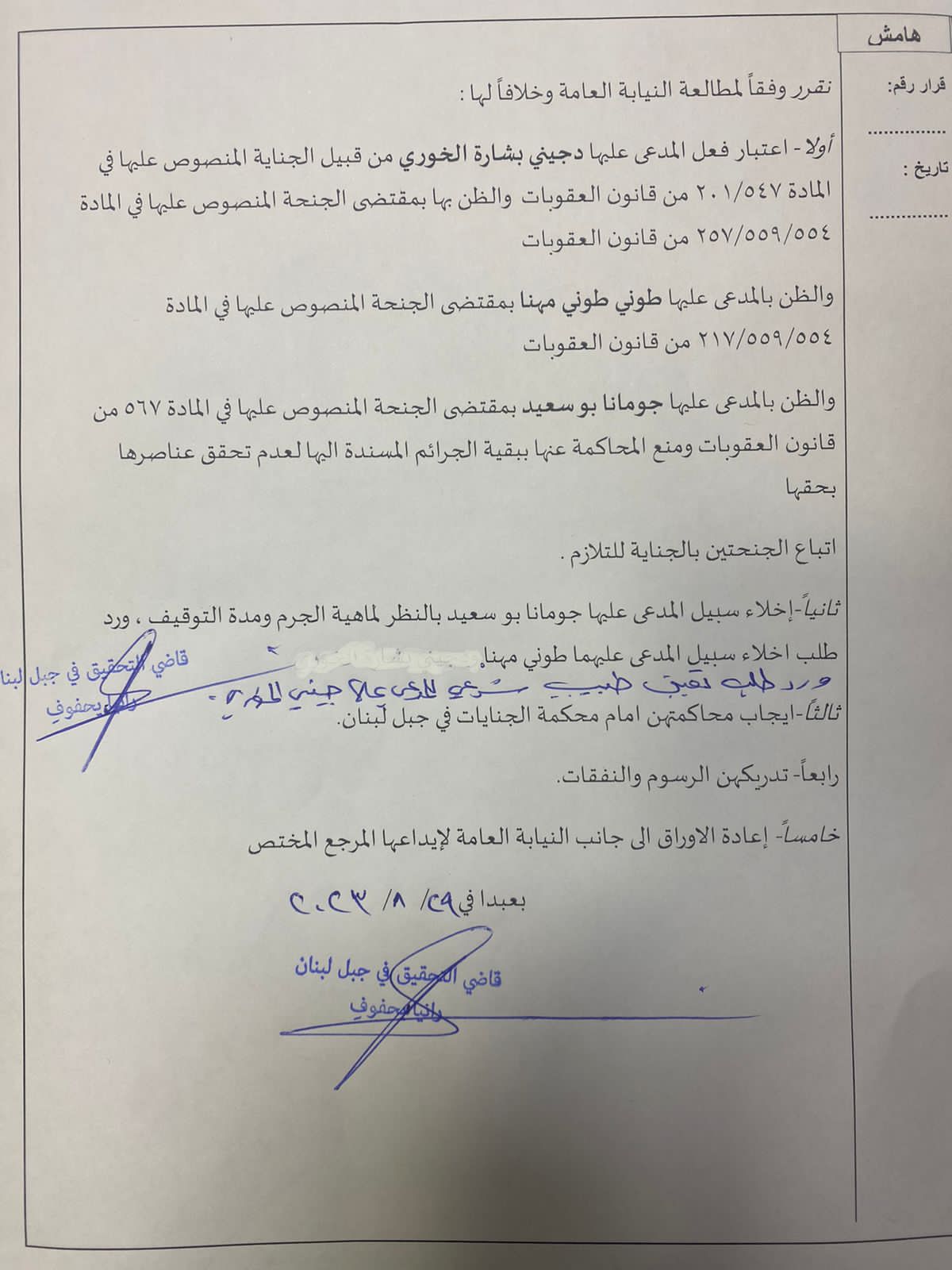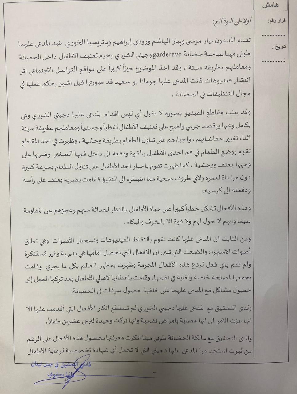 الرئيسيةأمن و قضاءصدور القرار الظني بقضية حضانة Gardereveأمن و قضاءشريط الاحداثصدور القرار الظني بقضية حضانة Gardereve صدر اليوم الثلاثاء، القرار الظني بقضية حضانة Gardereve.يذكر أن قضية الحضانة كانت قد انتشرت في الأسابيع الماضية، بعد ظهور مقاطع فيديو لموظفة في الحضانة تعنف الأطفال في، وقد تدخل المعنيون فورًا وتم إقفالها.القرار الصادر مرفق في الصور التالية: Tagsتعنيف اطفالحضانةقرار ظنيقضية Gardereveشريط الأحداثجريح بحادث صدم على اوتوستراد الكرنتينا 05/02/2026 توقيف أمينة صندوق بلدية صيدا وفتح تحقيقات بعد فقدان أموال 05/02/2026 “الحرس الثوري” يوقف سفينتين في مياه الخليج 05/02/2026 “حربي” فوق الضاحية 05/02/2026 مقالات ذات صلة أمن و قضاءجريح بحادث صدم على اوتوستراد الكرنتينا 05/02/2026 أمن و قضاءتوقيف أمينة صندوق بلدية صيدا وفتح تحقيقات بعد فقدان أموال 05/02/2026 شريط الاحداث“الحرس الثوري” يوقف سفينتين في مياه الخليج 05/02/2026