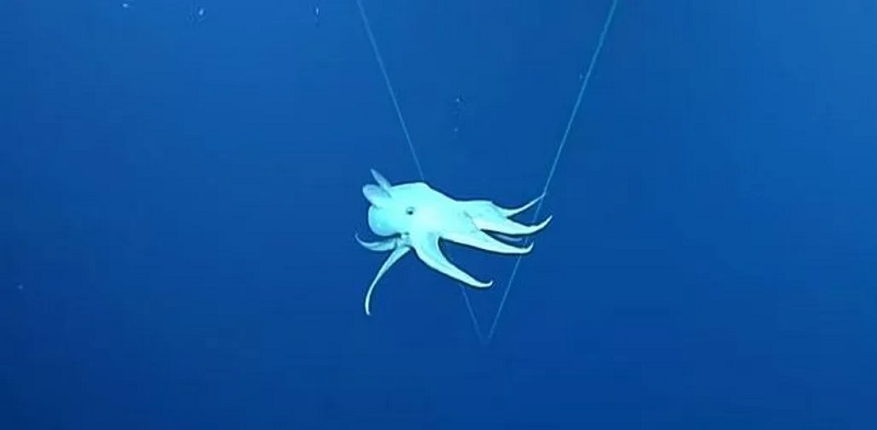 في ظهور نادر، شوهد أخطبوط من نوع يدعي “دامبو” على عمق حوالي 2665 مترا، رصدته مركبة تعمل عن بعد شمالي المحيط الهادئ، علما أن هذا النوع يعيش في مناطق أعمق.
