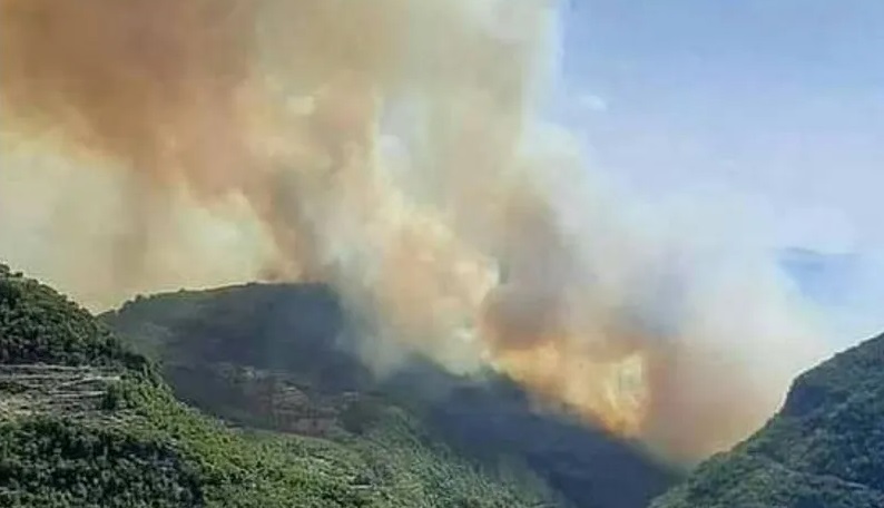 اندلع حريق ضخم، اليوم الجمعة، في قرية كاف الحمام ووادي صافي وسفح جبل جويدي، في منطقة الشيخ بدر، بمحافظة طرطوس السورية.