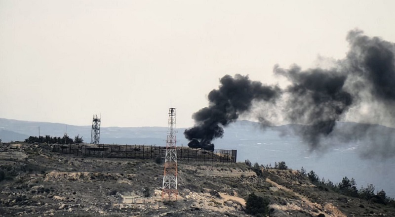 تصاعد الدخان من أحد الأحراج المحيطة بثكنة هونين ”رميم”، منذ الصباح الباكر مقابل بلدة مركبا.