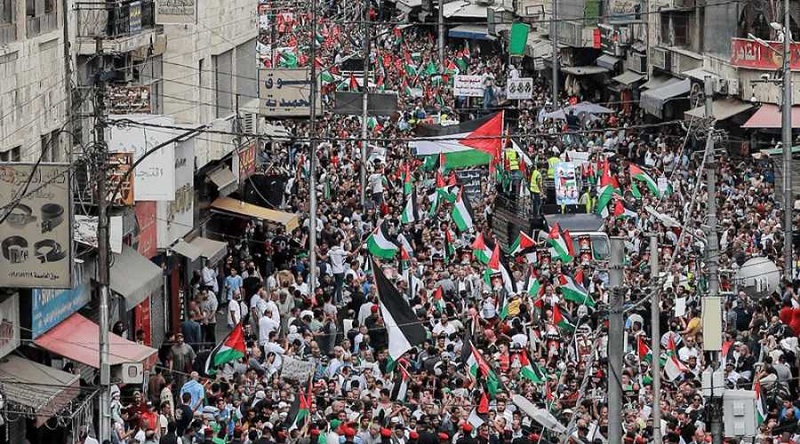 تظاهر ما لا يقل عن خمسة آلاف شخص في العاصمة عمان، بعد ظهر اليوم الجمعة، للمطالبة بإلغاء معاهدة السلام بين الأردن و “إسرائيل” التي وقعت عام 1994، تضامناً مع الفلسطينيين وتنديداً بتواصل القصف “الإسرائيلي” على قطاع غزة، وهتفوا “وادي عربة مش سلام، وادي عربة استسلام”، في إشارة إلى اتفاق السلام الذي تصادف، اليوم الخميس، الذكرى الـ29 لتوقيعه.