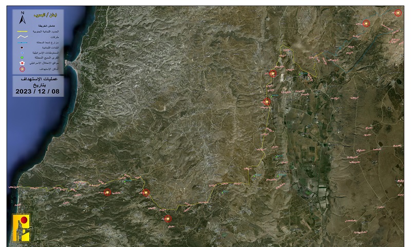 أصدرت المقاومة الإسلامية اليوم الجمعة بتاريخ 2023/12/08 ثمانية (8) بيانات عسكرية تضمّنت ثماني (8) عمليات استهدفت قواعد ومواقع وانتشار جيش العدو الإسرائيلي في القطاعَين الشرقي والغربي عند الحدود اللبنانية الفلسطينية.