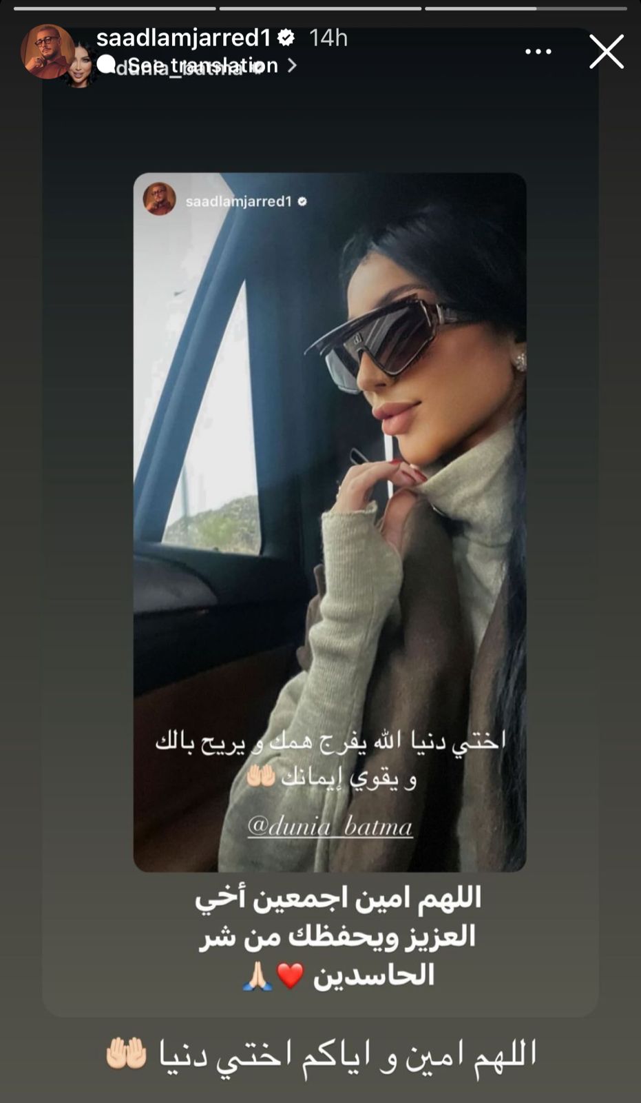 وشارك لمجرد عبر خاصية “الستوري” في مصنة “إنستغرام”، صورة للمغنية المغربية، أرفقها بتعليق: “أختي دنيا.. الله يفرج همك ويريح بالك ويقوي إيمانك”.