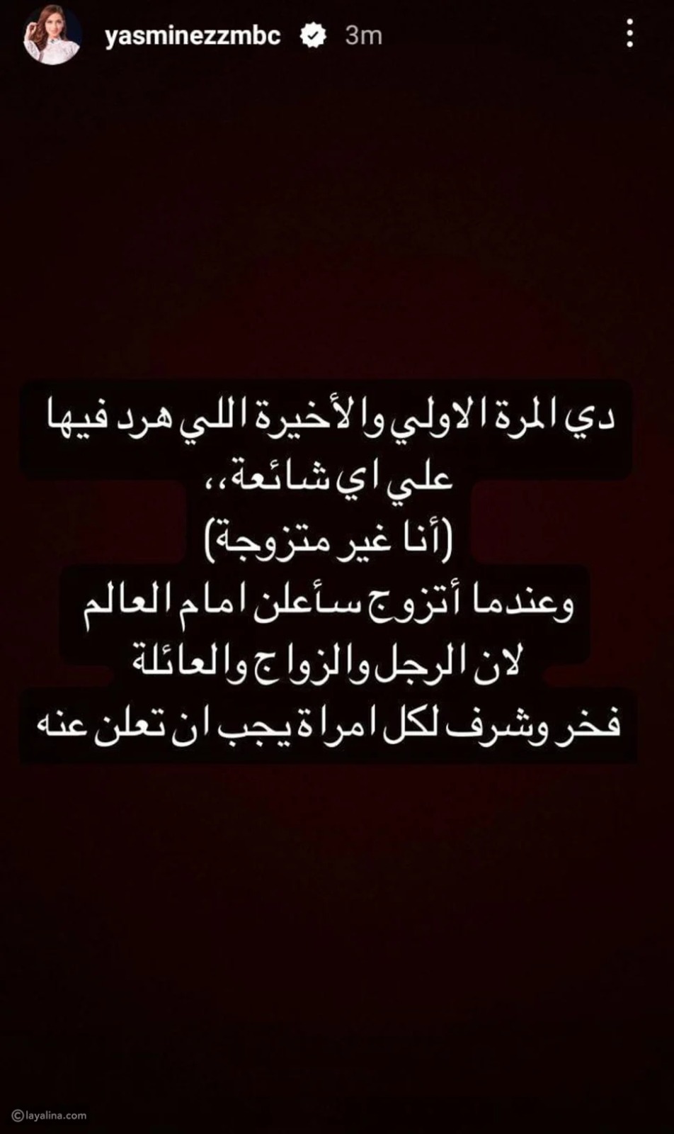 وفي التفاصيل، نشرت ياسمين عز عبر خاصية القصص القصيرة على حسابها عبر “إنستغرام” وقالت: “دي المرة الأولى والأخيرة اللي هرد فيها على أي شائعة، أنا غير متزوجة، عندما سأتزوج سأعلن أمام العالم، لأن الرجل والزواج والعائلة فخر وشرف لكل امرأة يجب أن تعلن عنه”.