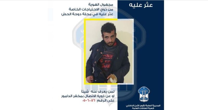 عممت المديرية العامة لقوى الأمن الداخلي، بناءً على إشارة القضاء المختص، “صورة شخص من ذوي الاحتياجات الخاصة وهو مجهول الهوية عثر عليه بتاريخ 20-3-2024 في محلة دوحة الحص، وليس بحوزته أي مستند يعرّف عنه، ولا يمكن التواصل معه، ولا يمكنه تحديد مكان إقامته”.