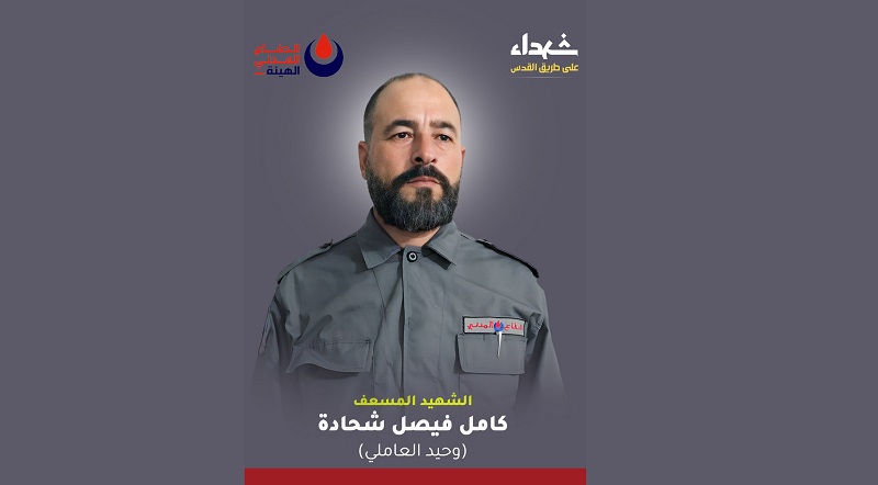 نعت المديرية العامة للدفاع المدني – الهيئة الصحية الشهيد المسعف كامل فيصل شحادة. وقالت في بيان: بمزيد من الفخر والإعتزاز، تزف المديرية العامة للدفاع المدني – الهيئة الشهيد المسعف كامل فيصل شحادة “وحيد العاملي” مواليد العام 1968 من بلدة دير انطار في جنوب لبنان، والذي ارتقى شهيداً على طريق القدس.
