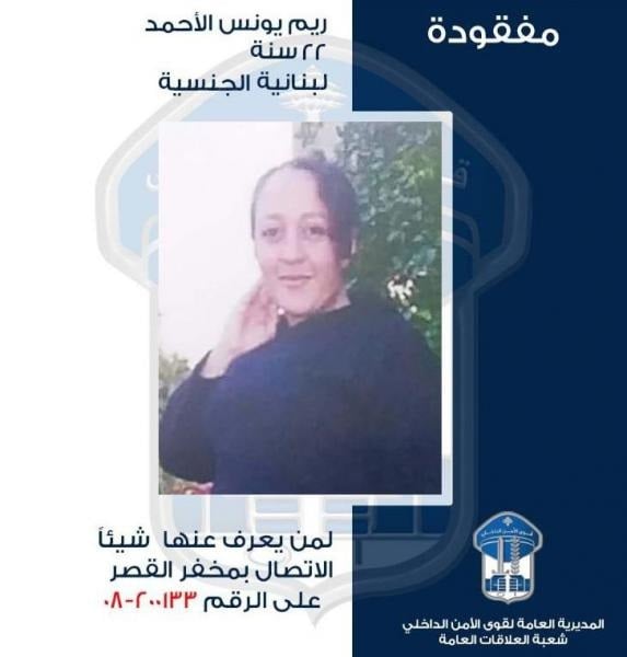 عمّمت المديريّة العامّة لقوى الأمن الداخلي، بناءً على إشارة القضاء المختص، صورة المفقودة ريم يونس الأحمد (من مواليد عام 2002، لبنانيّة)، التي غادرت بتاريخ 12-5-2024، منزل ذويها الكائن في بلدة القصر، ولم تَعُد لغاية تاريخه.