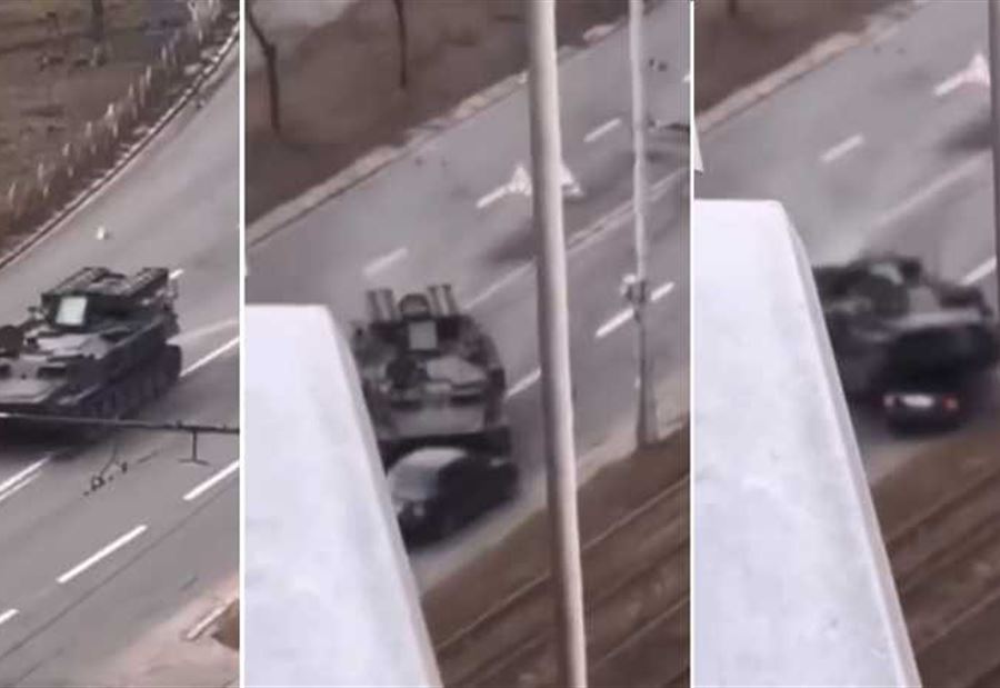 أظهرت مقاطع مصورة في أوكرانيا لحظات مروعة لحادثة سحق سيارة مدنية بواسطة دبابة روسية في إحدى ضواحي العاصمة كييف.