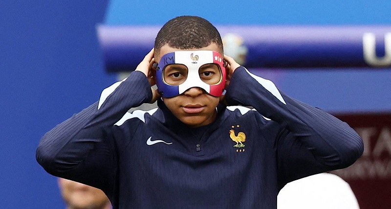 وإرتدى مبابي في تدريبات المنتخب الفرنسي أمس الخميس، قناعا طبيا بعد إصابته بكسر في الأنف خلال المباراة الأولى أمام النمسا يوم الإثنين الماضي.
