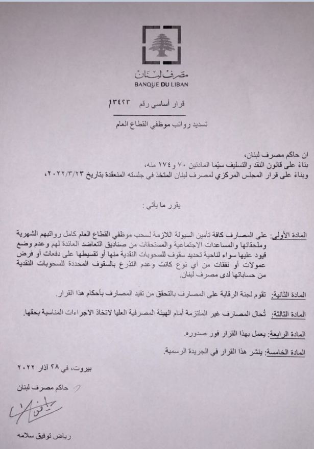 أصدر حاكم مصرف لبنان بناء على قانون النقد والتسليف سيما المادتين 70 و 174 منه، وبناء على قرار المجلس المركزي لمصرف لبنان، المتخذ في جلسته المنعقدة بتاريخ 23-3-2022، قرارا حول تسديد رواتب موظفي القطاع العام.