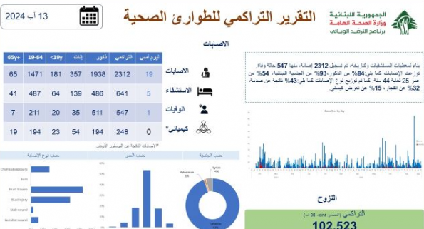 الرئيسيةأمن و قضاء547 شهيداً بالعدوان على لبنانأمن و قضاءشريط الاحداث547 شهيداً بالعدوان على لبنان نشرت وزارة الصحة العامة، متابعةً للعدوان الاسرائيلي على لبنان، التقرير التراكمي للطوارئ الصحية لـ 13 آب 2024، حيث تم تسجيل 2312 اصابة، منها 547 حالة وفاة.Tagsجرحىشهداءعدوان اسرائيليوزارة الصحة اللبنانيةشريط الأحداثتفجير في كفركلا 17/01/2026 لبنان بين تحديات الداخل وحضور المقاومة.. وواشنطن تتحرك دبلوماسيًا وعسكريًا في الشرق الأوسط 17/01/2026 رشقات على بليدا 17/01/2026 “موظفي الإدارة العامة” يواصلون الإعتكاف الأسبوع المقبل 17/01/2026 مقالات ذات صلة أمن و قضاءتفجير في كفركلا 17/01/2026 سياسةلبنان بين تحديات الداخل وحضور المقاومة.. وواشنطن تتحرك دبلوماسيًا وعسكريًا في الشرق الأوسط 17/01/2026 أمن و قضاءرشقات على بليدا 17/01/2026
