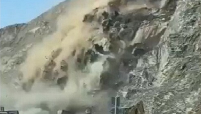 وثق مقطع فيديو متداول انهيارا صخريا كبيرا بوادي عسلان على طريق محايل بحر أبو سكينة بمنطقة عسير جنوب غربي السعودية.