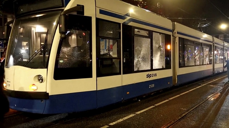 أضرم مجهولون مسلحون بالعصي والمفرقعات النار في ترام في أمستردام، خلال احتجاجات مؤيدة لفلسطين، وقد تمكن ركاب وسائق الترام من مغادرته ولم يصب أحد بجروح.