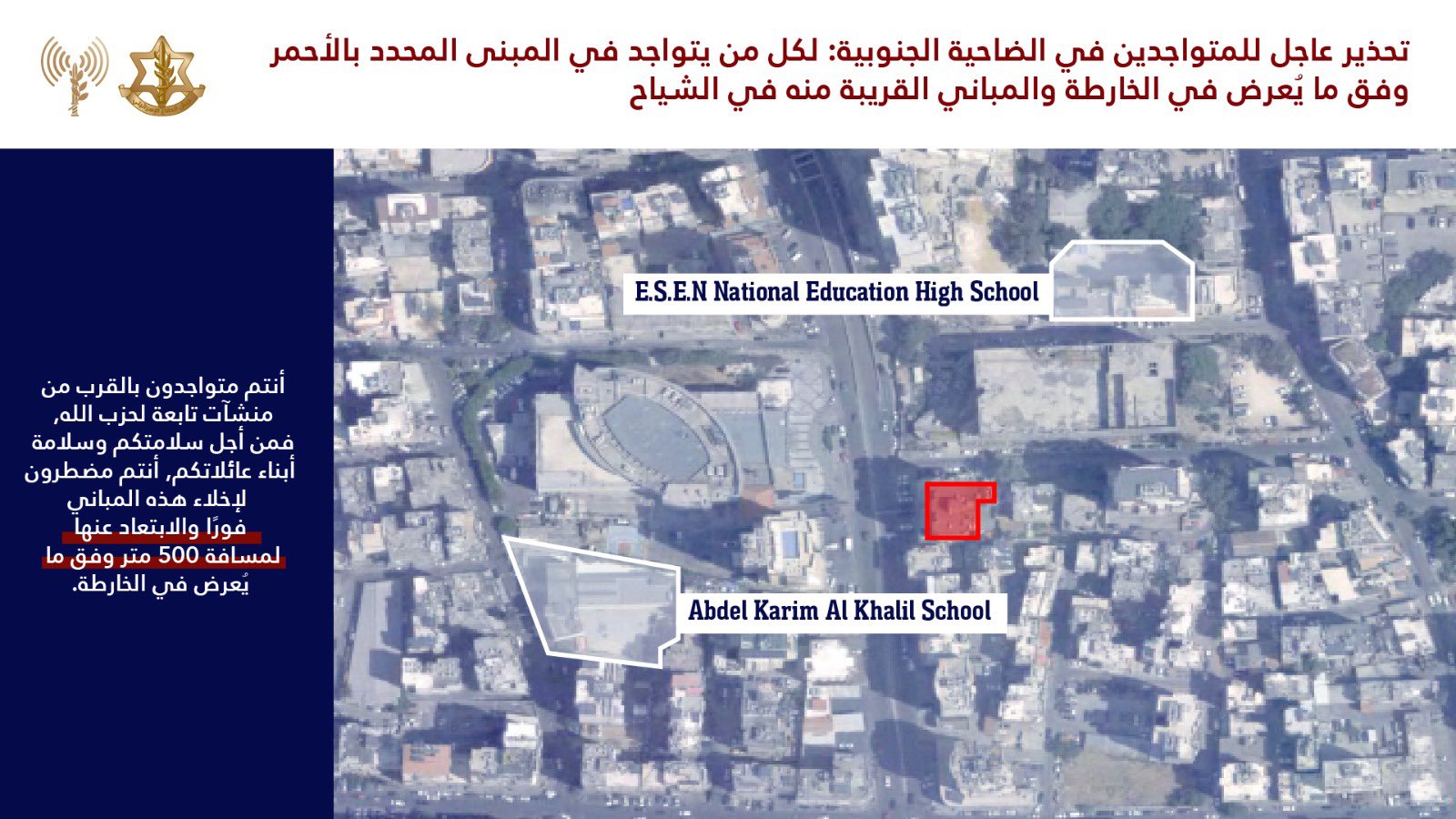 وقال: “أنتم تتواجدون بالقرب من منشآت ومصالح تابعة لحزب الله حيث سيعمل ضدها جيش الدفاع على المدى الزمني القريب، من أجل سلامتكم وسلامة أبناء عائلتكم عليكم اخلاء هذه المباني وتلك المجاورة لها فورًا والابتعاد عنها لمسافة لا تقل عن 500 متر”.