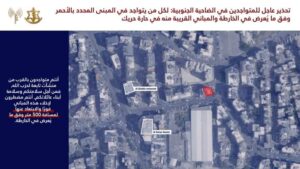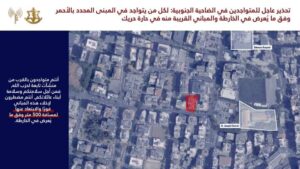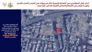 وجه المتحدث بإسم جيش الإحتلال أفيخاي أدرعي انذاراً عاجلاً إلى جميع السكان المتواجدين في منطقة الضاحية الجنوبية وتحديدًا في المباني المحددة في الخرائط المرفقة والمباني المجاورة لها في حارة حريك