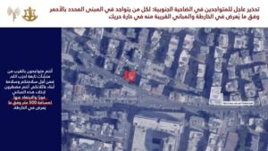 وقال: “أنتم تتواجدون بالقرب من منشآت ومصالح تابعة لحزب الله حيث سيعمل ضدها جيش الدفاع بقوة على المدى الزمني القريب، من أجل سلامتكم وسلامة أبناء عائلتكم عليكم اخلاء هذه المباني وتلك المجاورة لها فورًا والابتعاد عنها لمسافة لا تقل عن 500 متر”.