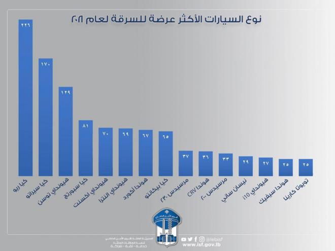 عمّمت المديرية العامة لقوى الأمن الداخلي رسماً بيانياً لـ /15/ نوعًا من السيارات التي كانت الأكثر عرضةً للسرقة في خلال عام 2021، والتّي بلغ عددها /1602/ سيارة من /226/ نوعًا مختلفًا، وفي هذا الإطار قامت قوى الامن الداخلي بتوقيف /375/ شخصًا.