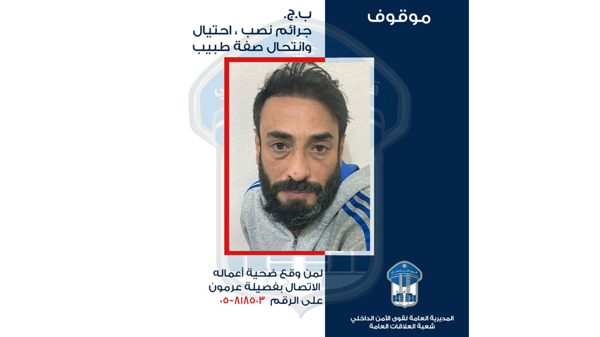 عممت المديريّة العامّة لقوى الأمن الدّاخلي بناء على إشارة القضاء المُختصّ، صورة الموقوف ب. ج. (مواليد عام 1983، لبناني) من أصحاب السّوابق، ومطلوب للقضاء بجرائم نصب واحتيال، وانتحال صفة طبيب، وسرقة، وضرب وإيذاء.