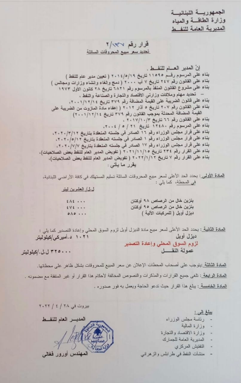 بنزين 98 أوكتان: 484000 ليرة