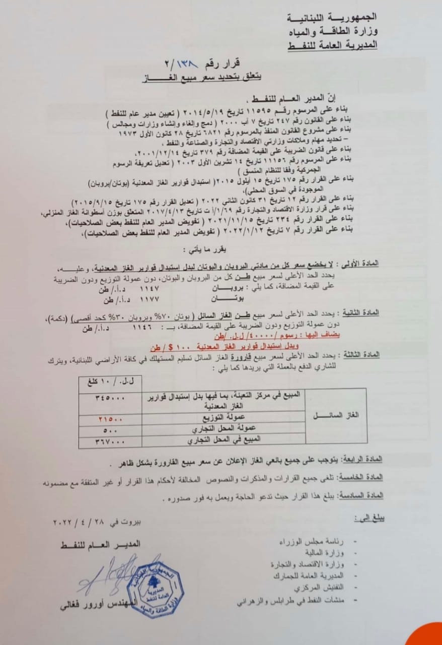 الغاز: 367000 ليرة