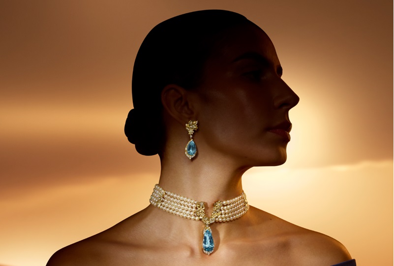 تزدان هذه المجموعة بقطعٍ مميزة تجمع بين الإبداع والحرفية الرفيعة. قلادة “حديقة النور” تعكس سحر الطبيعة، حيث يتوسطها حجر أكوامارين فاخر بوزن 17.9 قيراطًا، تحيط به لآلئ أكويا اليابانية، لتجسد تناغم الطبيعة في أبهى صورها.