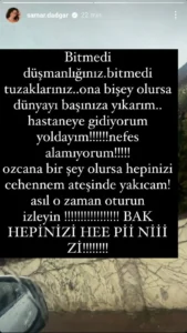 وأضافت: “إن حدث له شيء، سأجعل العالم ينهار فوق رؤوسكم. أنا في طريقي إلى المستشفى، لا أستطيع التنفس، وإن أصاب أوزجان أي مكروه، سأحرقكم جميعًا بنار الجحيم. حينها فقط ستجلسون وتشاهدون. أنا جادة في كلامي، كلكم”.