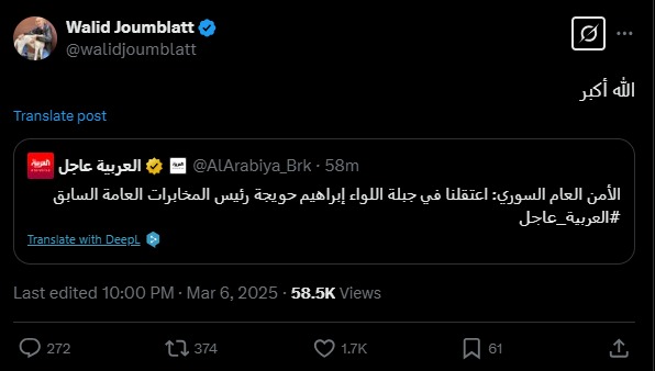 شارك رئيس “الحزب التقدمي الإشتراكي” السابق وليد جنبلاط الخبر الذي نشرته قناة “العربية” نقلاً عن الأمن العام السوري بشأن اعتقال رئيس المخابرات السورية السابق اللواء إبراهيم حويجة، المتهم بالإشراف على اغتيال والده الزعيم اللبناني كمال جنبلاط، وأرفقه بعبارة “الله أكبر”.