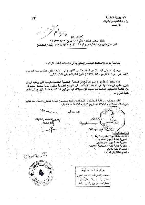 أصدر وزير الداخلية والبلديات أحمد الحجار، التعميم رقم 2/إم/2025 المتعلق بتعديل القانون رقم 665 تاريخ 29/12/1997، الذي عدل المرسوم الاشتراعي رقم 118 تاريخ 30/6/1997 حول ترشيح السيدات لعضوية مجلس البلدية .