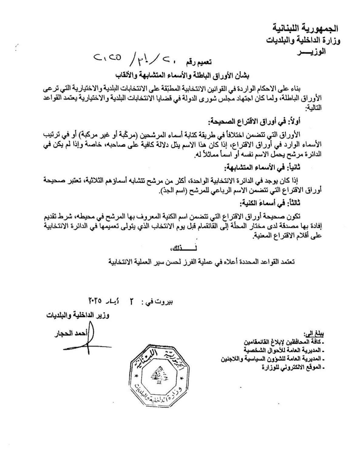 عممت وزارة الدخلية والبلديات شروطاً بشأن الأوراق الباطلة والأسماء المتشابهة والألقاب.