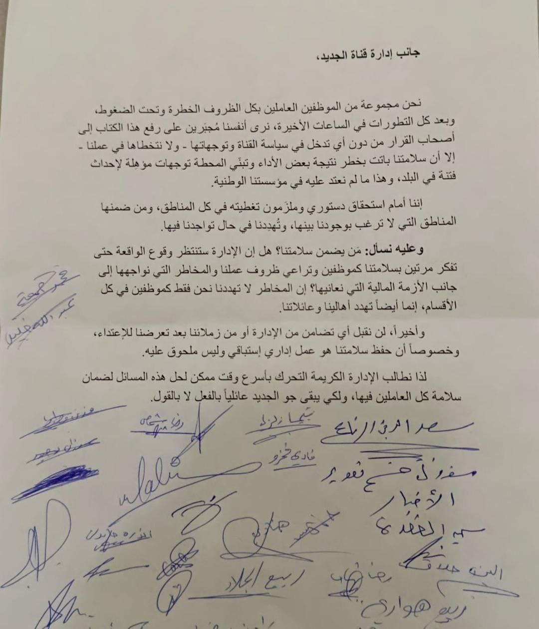 وجه عدد من العاملين في قناة “الجديد” كتاباً إلى إدارة المحطة طالبوا فيه الإدارة باتخاذ خطوة أساسية، بعد تبنيها “توجهات مؤهلة لإحداث فتنة في البلد” كما ورد في الكتاب.