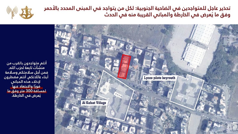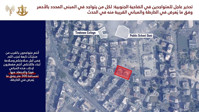 وقال افيخاي ادرعي في بيان: “لكل من يتواجد في المبنى المحدد بالأحمر وفق ما يُعرض في الخارطة والمباني المجاورة له: أنتم تتواجدون بالقرب من منشآت تابعة لحزب الله، من أجل سلامتكم وسلامة أبناء عائلاتكم أنتم مضطرون لإخلاء هذه المباني فوراً والابتعاد عنها المسافة لا تقل عن 300 متر وفق ما يُعرض في الخارطة”.